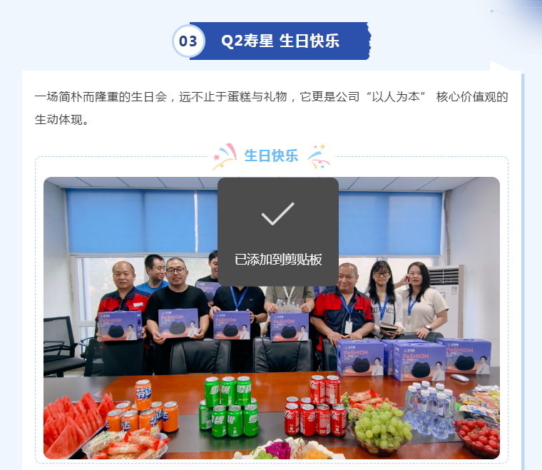 我们始终相信员工是公司最宝贵的财富,未来我们将持续创新员工关怀形式,丰富企业文化内涵,努力营造更有温度、更具活力、更富归属感的工作环境,让每一位伙伴都能在这里快乐工作、幸福生活、共同成长!